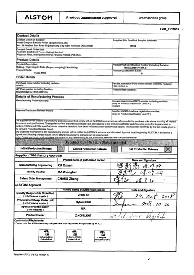 2008年我公司為ALSTOM提供的汽缸螺栓通過了FPR(完全放行文件)、并且成為國(guó)內(nèi)唯一一家ALSTOM授予
